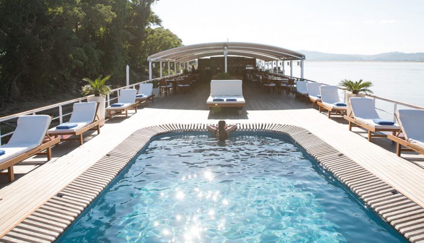 Rückkehr zum Schiff zum Mittagessen und Weitersegeln. An diesem Nachmittag betritt Belmond Road to Mandalay den ersten landschaftlichen Hohlweg oder Schlucht, die einige Stunden später auftritt. Dies ist die perfekte Zeit, um sich auf dem Aussichtsdeck oder am Pool zu entspannen und die atemberaubende Aussicht zu genießen.