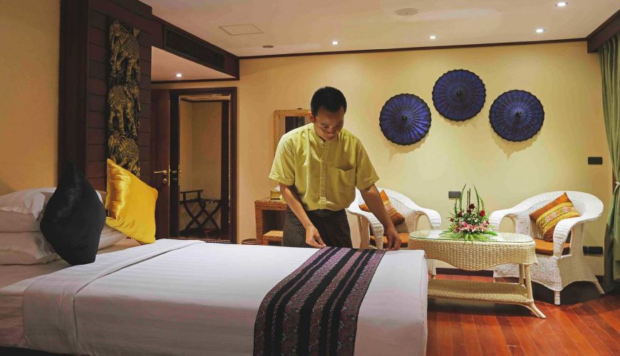 Luxuriös gestaltet sind diese beiden Suiten sind sicherlich die beste Wahl für alle, die die beste Reise in Myanmar verbringen möchten. Da die Suiten mit eigenen Balkonen und vom Boden bis Decke hohen Fenstern ausgestattet sind, können Sie die wunderschöne Aussicht der Landschaft genießen. Erkunden Sie die berühmten Sehenswürdigkeiten oder nehmen Sie an spannenden Aktivitäten teil, bevor Sie nachts auf dem bequemen Kingsize Bett übernachten.