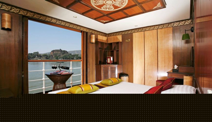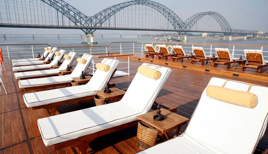 Das Oberdeck bietet 02 Suite Kabine am Bogen mit einer Fläche von 25 qm, Doppelbett/Zwei Einzelbette. Diese liegen am Bogen des Schiffes. Jede Kabine verfügt über 3 Fenster und französische Balkone, die einen außergewöhnlichen Blick auf den Fluss bieten. Das Design der Suite ist eine exzellente Mischung aus modernem, zeitgenössischem und traditionellem Myanmarischem Stil, gefertigt von Teakholz, sowie antike Kunsthandwerken und wunderschöne Seidendekorationen.
