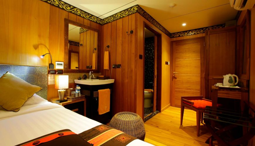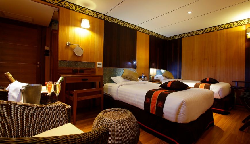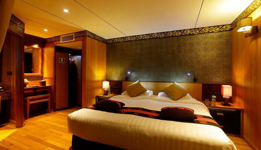 Das Oberdeck bietet 02 Einzelkabinen mit einer Fläche von 25 qm, Einzelbett. Das Zimmers ist massiv und gemütlich und bietet den Passagieren eine entspannende und komfortable Erfahrung. Jede Kabine ist klimatisiert und erstklassigen Einrichtungen ausgestattet, einschließlich einem privaten Badezimmer mit Warmwasserdusche.