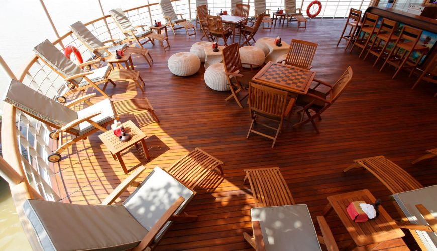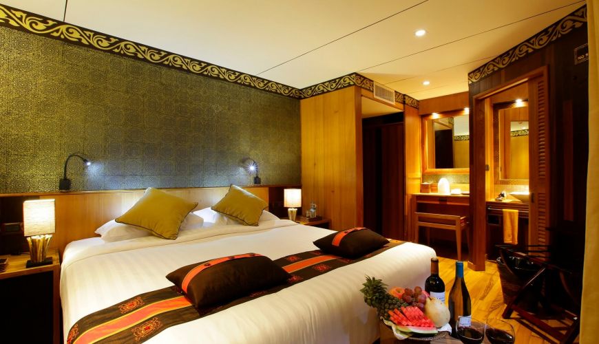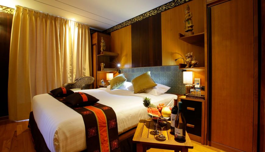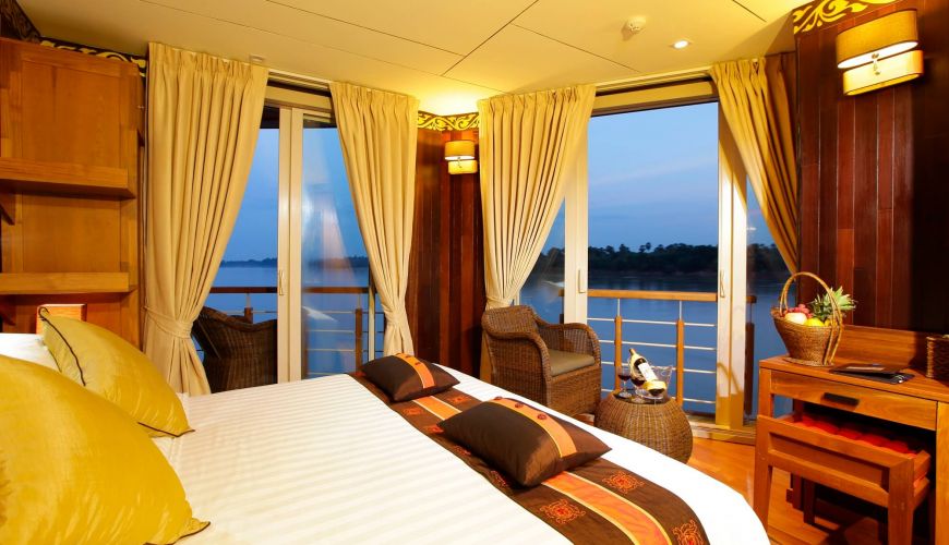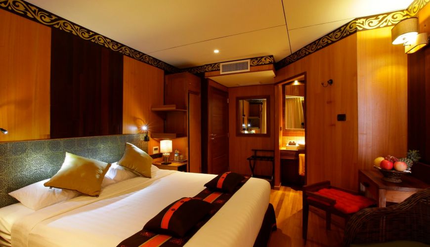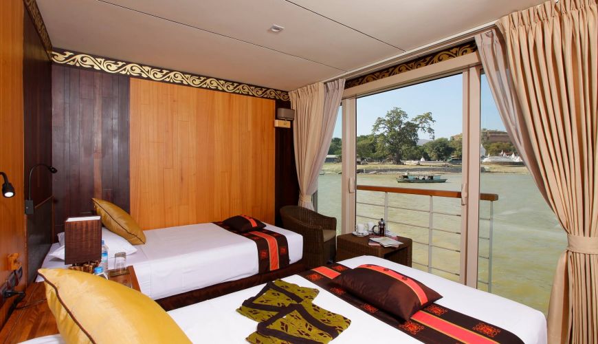 Das Hauptdeck bietet 08 Deluxe mit französischem Balkon mit einer Fläche von 23 qm, zwei Einzelbetten. Das Design des Zimmers ist eine Kombination aus modernem zeitgenössischem Stil und traditionellem Burmesischem Stil, gefertigt von Teak mit antiken, handgefertigten Dekorationen. Alle Kabinen sind mit Klimaanlage und erstklassigen Einrichtungen ausgestattet, einschließlich einem privaten Badezimmer mit Warmwasserdusche und ein französischer Balkon mit fantastischem Blick auf den Fluss.