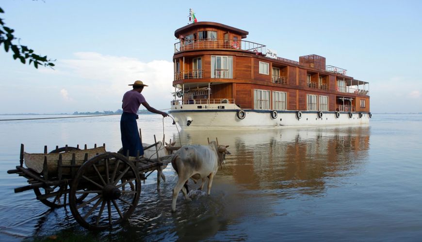 Wir machen einen Ausflug zu den Bagan Märkten mit Seide, Holzschnitzereien, Longyis und Rattenprodukten. Wir besuchen auch eine Werkstatt und schauen uns die alte Lackkunst an. Wir können aus anderen Optionen wählen, wie z. B. unabhängige Entdeckung auf Pferdewagen / Fahrrad oder auf dem spektakulären Ballonflug über Bagan teilnehmen (gegen Aufpreis). Mittags kehren wir zur Kreuzfahrt zurück und setzen die Segel. Wir verbringen die meiste Zeit flussaufwärts. Wir kommen am Dorf Shwe Pyi Thar vorbei, um einen Spaziergang zu machen. Wir speisen zu Abend und genießen eine Puppenshow auf der Sonnenterrasse oder im Dorf. Wir bleiben in der Nähe des Mittelflusses, nahe der Mündung des Chindwin.