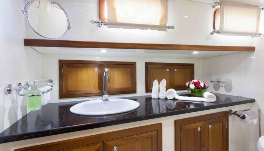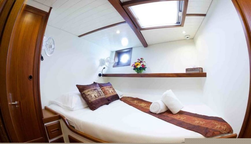 Die Yacht bietet Platz für bis zu acht Gäste, mit einer Master Kabine am Achterdeck, zwei Doppelkabinen und eine zwei Einzelbettenkabine. Alle Kabinen sind komplett ausgestattet und verfügen über ein privates Bad. Es gibt auch ein geräumiges Achterdeck mit Tisch und Sitzgelegenheiten, an dem Gäste Mahlzeiten und Getränke genießen können. Ein Vordeck für diejenigen, die die Aussicht und die Sonne genießen möchten.